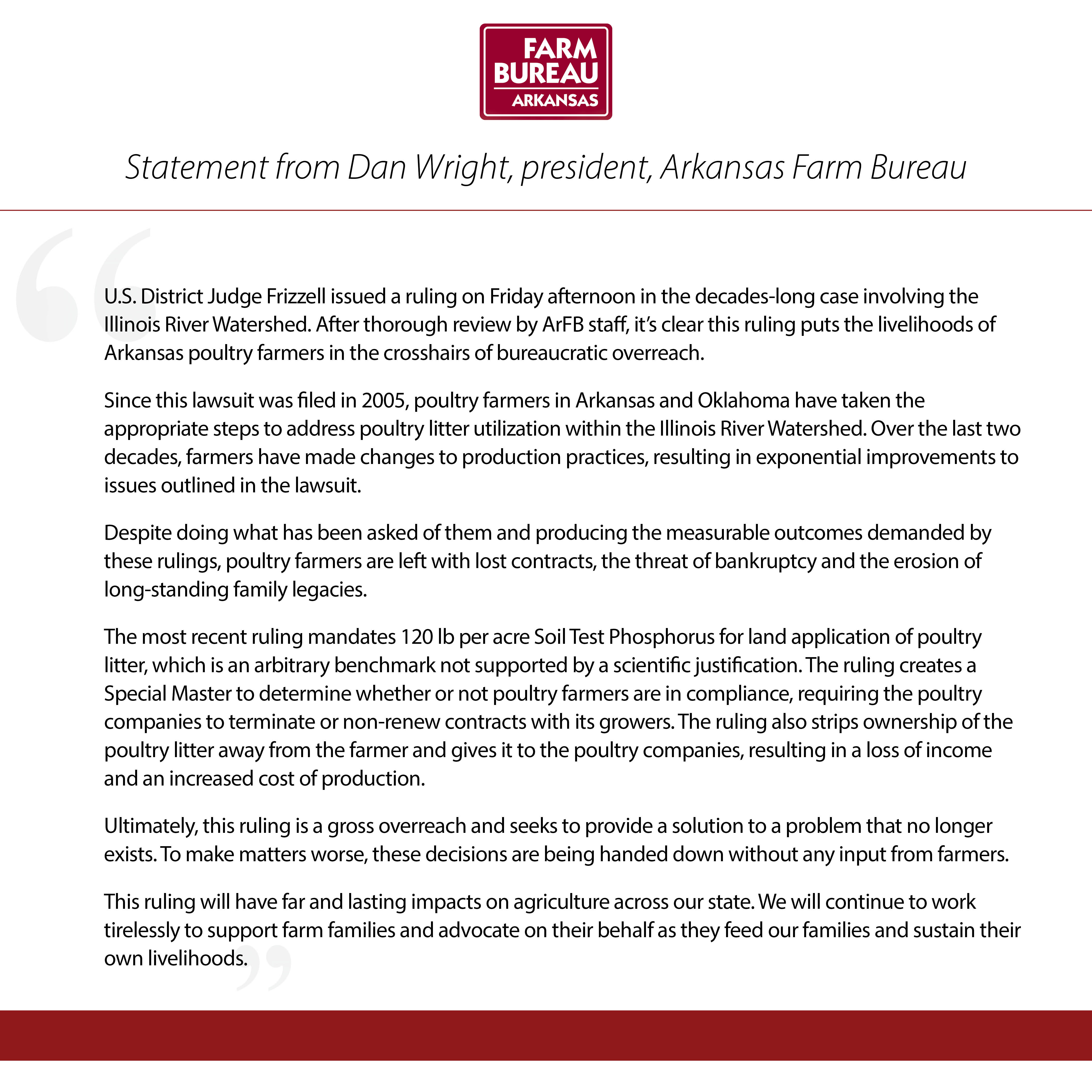Arkansas Farm Bureau President Dan Wright has issued a follow up statement after thorough review of U.S. District Judge Frizzell's ruling in the Illinois River Watershed court case.