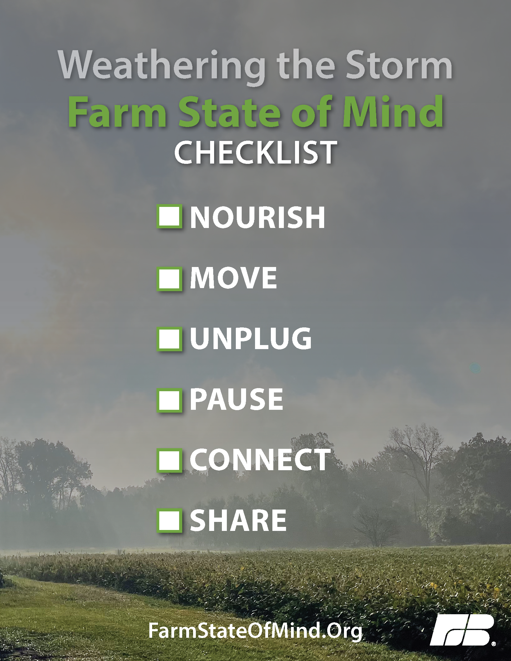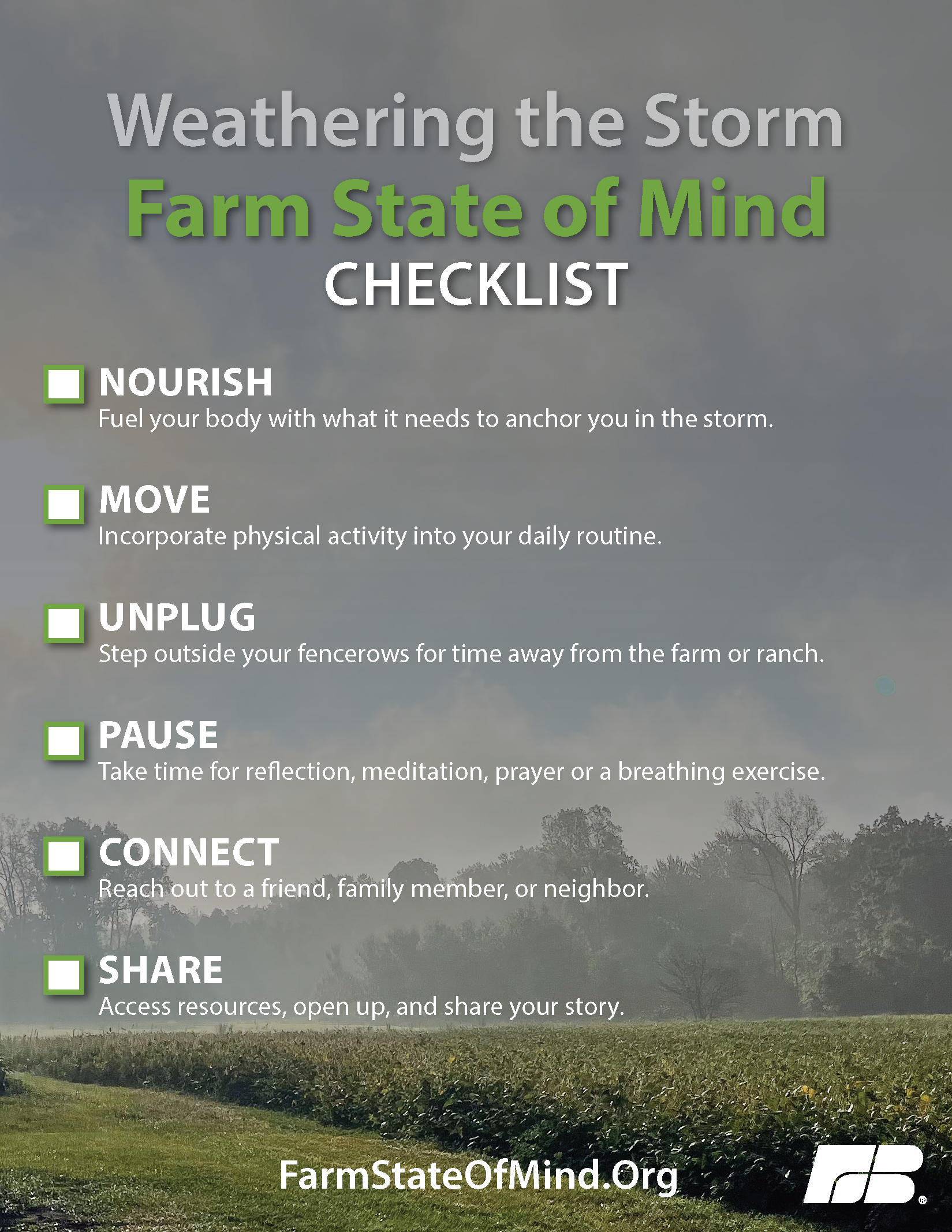 This Mental Health Awareness Month, remember that a healthy farm or ranch starts with a healthy you. Farmers are experts at checking in on their crops, livestock and equipment, but checking in on your own personal wellbeing is just as important. Farmers and ranchers don’t have to weather the storm alone. For nearly a decade since its inception, the Farm State of Mind initiative has focused on reducing the stigma around mental health and providing tools to help farmers, ranchers and their families. American Farm Bureau is unveiling a new resource dedicated to helping farmers and ranchers consider how to respond when stress becomes overwhelming and they don’t know what to do. It’s called the Farm State of Mind Checklist: Weathering the Storm.