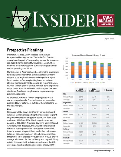 Arkansas Farm Bureau's team of commodity and agricultural economics experts will frequently provide data, analysis and commentary on the impacts of natural disasters, weather, pending state and federal legislation and more. These reports and graphics will be saved and organized here by year.